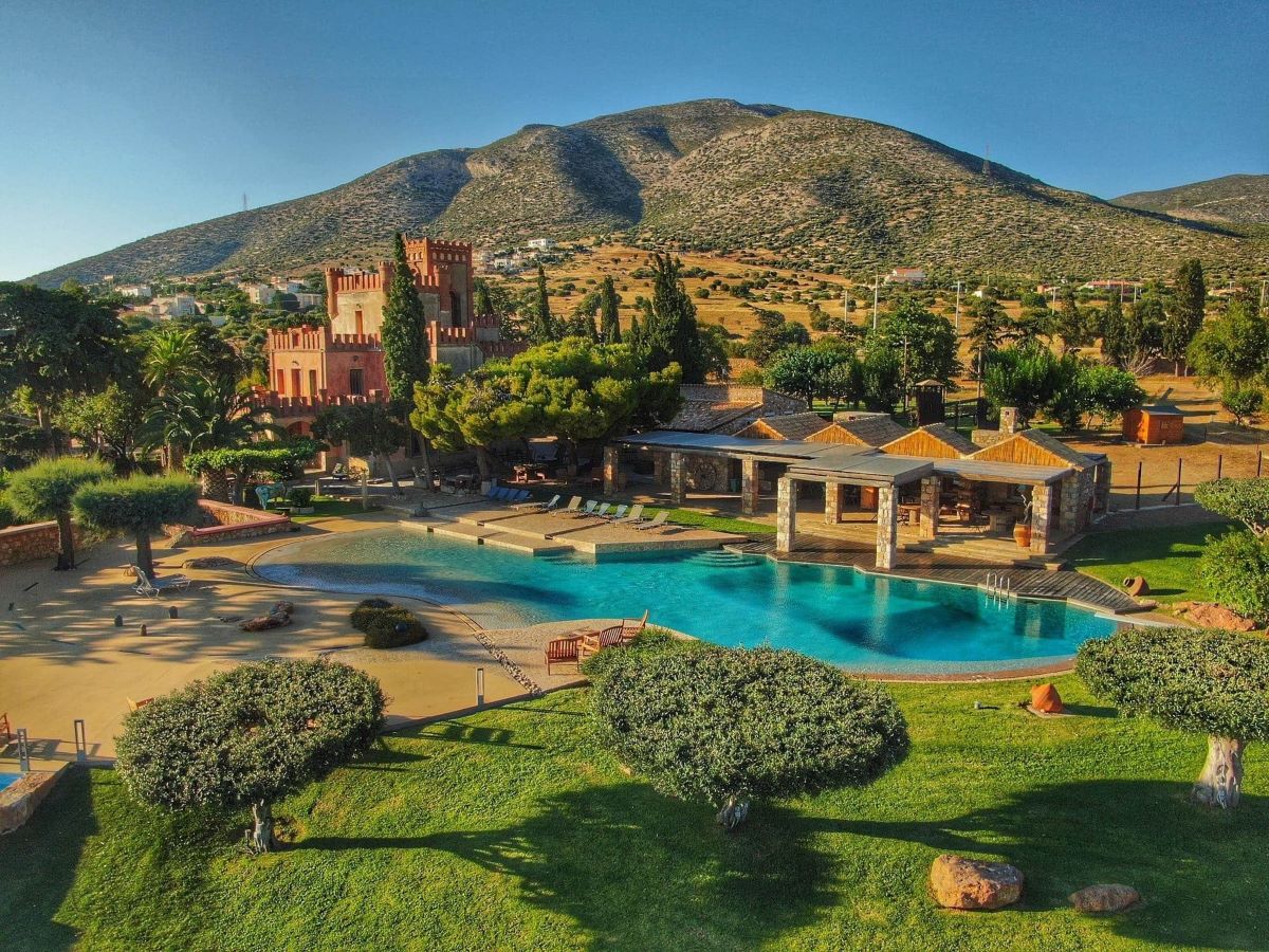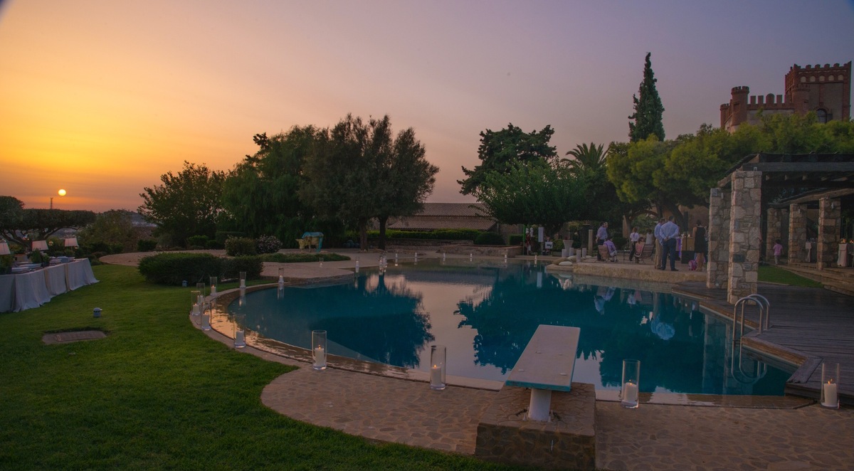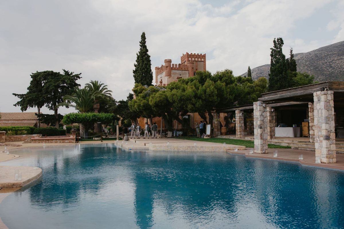 Γύρω από τον επιβλητικό Πύργο, απλώνεται το πάντα περιποιημένο καταπράσινο παχύ γκαζόν, όπου στήνονται τα τραπέζια των εκδηλώσεων, ακουμπώντας σχεδόν, στην ειδικά σχεδιασμένη, σαν φυσική λίμνη, πισίνα των 30μέτρων, με την δική της «παραλία», φτιαγμένη από άμμο κολλημένη στο έδαφος.
