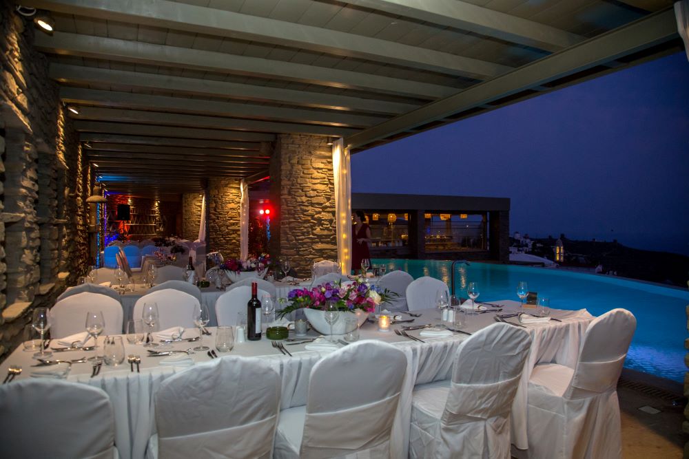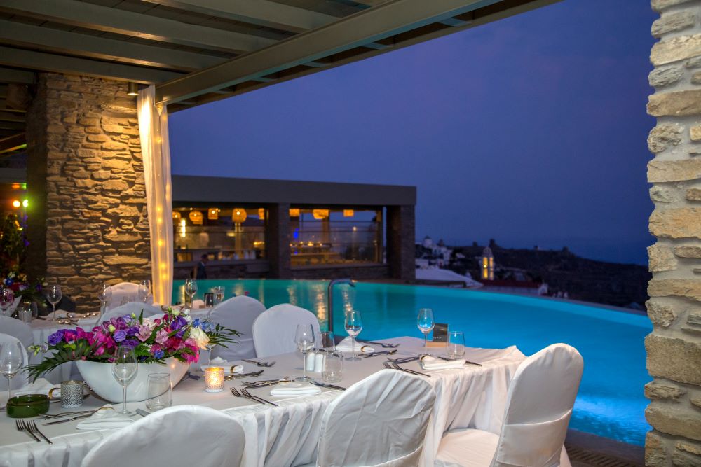 Our experts will personally arrange the decoration of both the church and the reception area, they can suggest or help you organize a perfect customized menu along with the most impressive wedding cake, as they will make all the arrangements for a professional camera/video recording crew for your ceremony along with ideal choices regarding thThe capacious infinity pool, which overlooks no less than eleven Cycladic islands from its location on Tinos, is an ideal setting for a memorable wedding or baptism reception while the seasoned chefs of the acclaimed "Zoga" and “Napule" restaurants prepare the most delicious of flavors for you and your guests with the signature of our chef and his team. Our cuisine covers all requirements and offers vegetarian and vegan dishes.